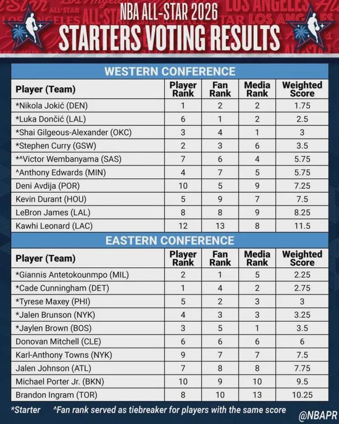 东契奇(斯洛文尼亚人)球迷投票高居第一,球员投票排名第六,媒体投票位列第二(权重为2.5)。