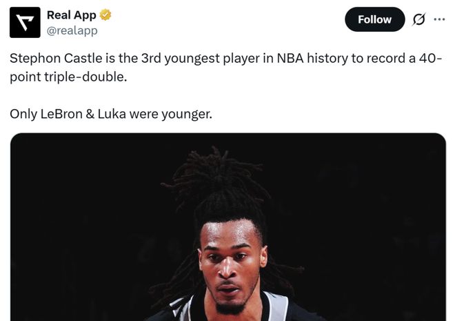 也成为NBA历史上砍下40+三双第三年轻的球员,仅次于詹姆斯和东契奇。