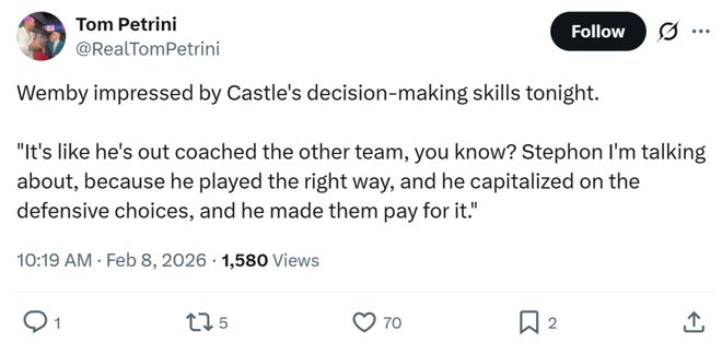 赛后文班也对卡斯尔本场出色的决策能力大加赞赏到:“感觉他就像教练组一样把对方耍得团团转,你懂我的意思吧?卡斯尔打得很合理,一直在作出正确的决策,抓住对手的漏洞,让他们付出了代价。”