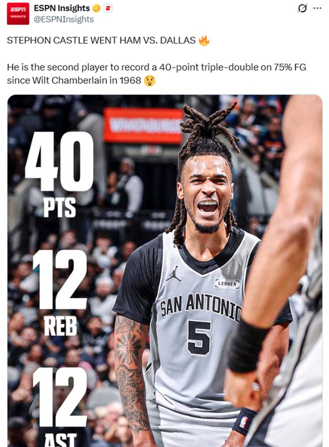 狂轰40分12板12助超级大三双,4号秀卡斯尔牛马大战刷爆纪录抢戏文班!马刺队4大新星齐暴走天赋溢出。
