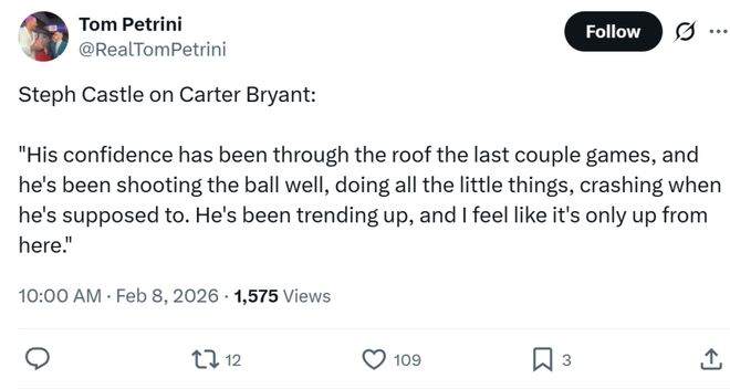 除此之外,卡斯尔称赞了另外一名新星卡特布莱恩特,直言自己感觉到了他在过去几场比赛信心爆棚,不仅投篮手感火热,细节也做得很到位,他的状态一直在提升,显然会越来越好。