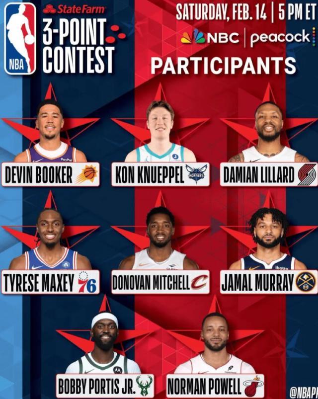 卫冕冠军德文·布克在列,同时两届冠军达米安·利拉德也将参赛,若成功夺冠,他将追平赛事历史三冠纪录。此外,马克西、多诺万·米切尔、贾马尔·穆雷、波蒂斯和诺曼·鲍威尔同样入选。