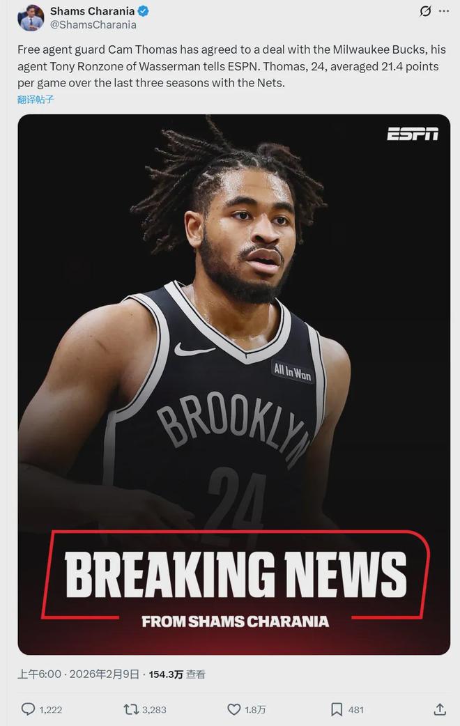 北京时间2月9日上午,据NBA名记Shams报道,自由球员卡梅伦-托马斯已经正式签约雄鹿。托马斯也是目前NBA买断市场最大牌球员!交易截止日之前,雄鹿将科尔-安东尼和科菲送到太阳,托马斯相当于顶替科尔-安东尼的位置。