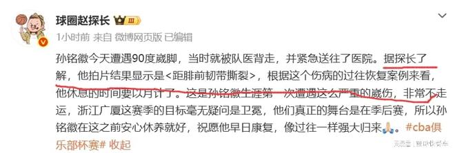 当然,真正糟糕的是,在比赛开场不久后,广厦的核心后卫孙铭徽便意外受伤。根据现场画面来看,孙铭徽是在一次突破中,误踩了迪亚洛的脚,意外崴脚。在谈到这一次崴脚时,孙铭徽毫不避讳的表示,这是他职业崴脚最严重的一次。随后,他被队友背着离开赛场。赛后,根据知情人士透露,孙铭徽这一次伤到了距腓前韧带撕裂,将会缺席接下来的比赛。而对于孙铭徽会缺席多久,根据该知情人士透露,孙铭徽此次伤停,恐怕会以月计。