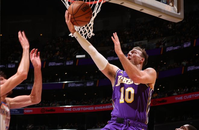 本场比赛中,在交易截止日前刚刚从亚特兰大老鹰加盟湖人的替补后场新援卢克-肯纳德(Luke Kennard)的表现还算是中规中矩。肯纳德全场出场24分13秒,投篮5中3,三分线外2中1,得到了7分1篮板1助攻1抢断的数据,还有4次犯规,正负值为-7。其实从表现来看,肯纳德的整体状态还是不错的,他在进攻端还是展现出了自己全面的得分能力,他的手感看起来也是不错的。问题就在于,肯纳德完全没有办法得到更多的出手机会,这种情况下他在进攻端的威力,特别是他的投射能力,也没有办法发挥出来。肯纳德本来就是一名攻强于守的球员,指望他在其他方面起到更大的作用显然也是一件不太现实的事情。很显然,湖人还是没有开发出肯纳德的最大价值,他的功能并没有体现出来。
