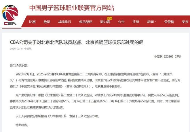赵睿不当言论被重罚,CBA官宣禁赛3场罚款5万,首钢被罚5万