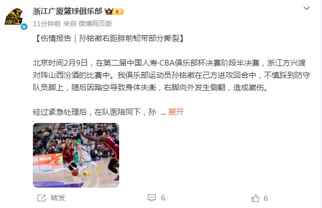 广厦官宣孙铭徽伤情:右距腓前韧带部分撕裂多处损伤 伤停6-8周