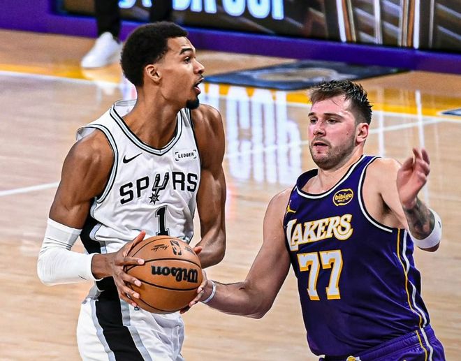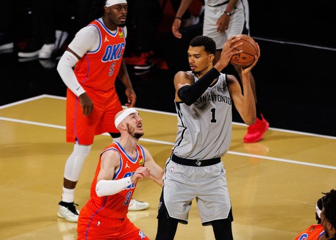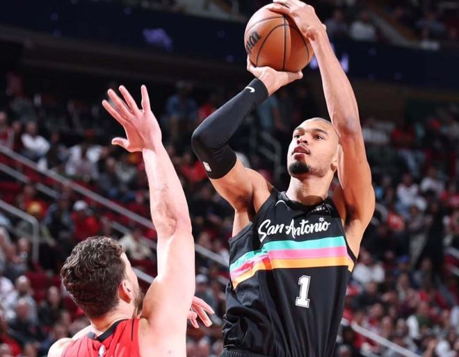 但有一支球队很容易被忽略,就是马刺。开赛以来马刺战绩37胜16负,本赛季五次遇到雷霆,他们赢了对手四场,堪称雷霆最大克星,没有之一。和雷霆、火箭、森林狼一样,在马刺得到状元文班亚马后,最近三个赛季,一步一个脚印,从23-24赛季的22胜60负,到上赛季34胜48负(文班亚马中段赛季报销),再到本赛季胜率接近7成,除了四号位没有太合适的人选,整个阵容框架找不出短板。而作为球队核心的文班亚马,在生涯第三个赛季,交出场均24.2分11篮板2.7助攻2.7盖帽的数据,和上赛季相比,甚至略有退步。