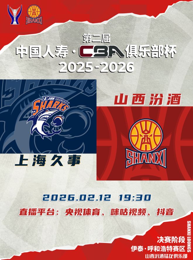 北京时间2026年2月12日19:30,第二届中国人寿·CBA俱乐部杯将迎来最终对决,山西汾酒与上海久事争夺冠军。本届杯赛,山西汾酒一路拼搏,以全胜战绩强势突围,最终站在决赛舞台!让我们继续全力以赴,为荣耀而战!球迷朋友们可通过央视体育、咪咕视频、抖音观看比赛实况,与山西汾酒一起为胜利呐喊,为热爱加冕!