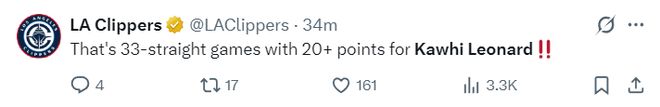 此役后小卡还连续33场比赛拿到20+快船队史独享历史第三。