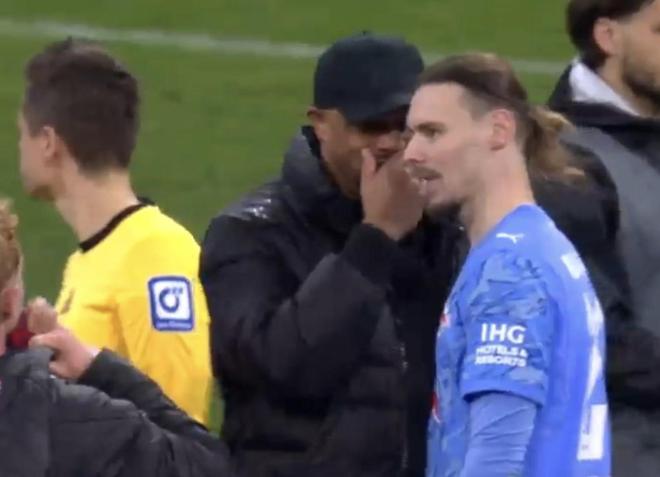 北京时间2月12日,德国杯1/4决赛,拜仁慕尼黑2-0RB莱比锡。赛后,拜仁慕尼黑主教练孔帕尼与莱比锡门将范德沃特说起了悄悄话。