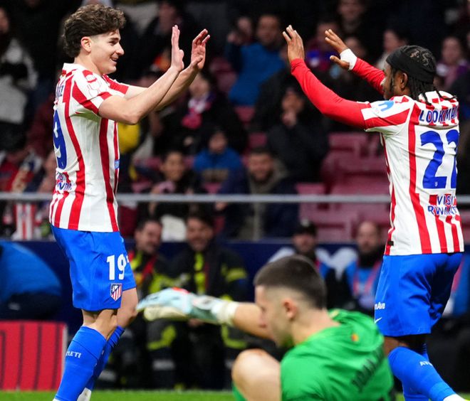 第23分钟,格列兹曼在禁区前沿起脚劲射,这一次门将侧扑把球没收。紧接着,阿尔瓦雷斯也获得机会,但他的低射被孔德极限解围,非常可惜。8分钟后,格列兹曼在禁区内的推射踢高了。第34分钟,马竞再次进球!阿尔瓦雷斯送出横传,卢克曼后插上低射破门!太疯狂了,马竞3球领先!