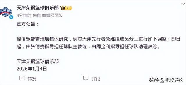 北京时间1月4日,根据天津男篮官方社媒的公示,经俱乐部管理层集体研究,现对天津先行者教练组成员分工进行如下调整:即日起,由张德贵指导担任球队主教练,由周金利指导担任球队助理教练。