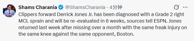 北京时间1月5日,据名记Shams报道,消息源透露,快船队前锋小德里克-琼斯被诊断为右膝内侧副韧带二级扭伤,六周后将重新评估伤情。上周他才刚刚伤愈归队,此前他曾因同一膝盖、在对阵同一对手凯尔特人时遭遇的同一意外伤病,缺席了一个多月的比赛。这次也要至少休战六周了。