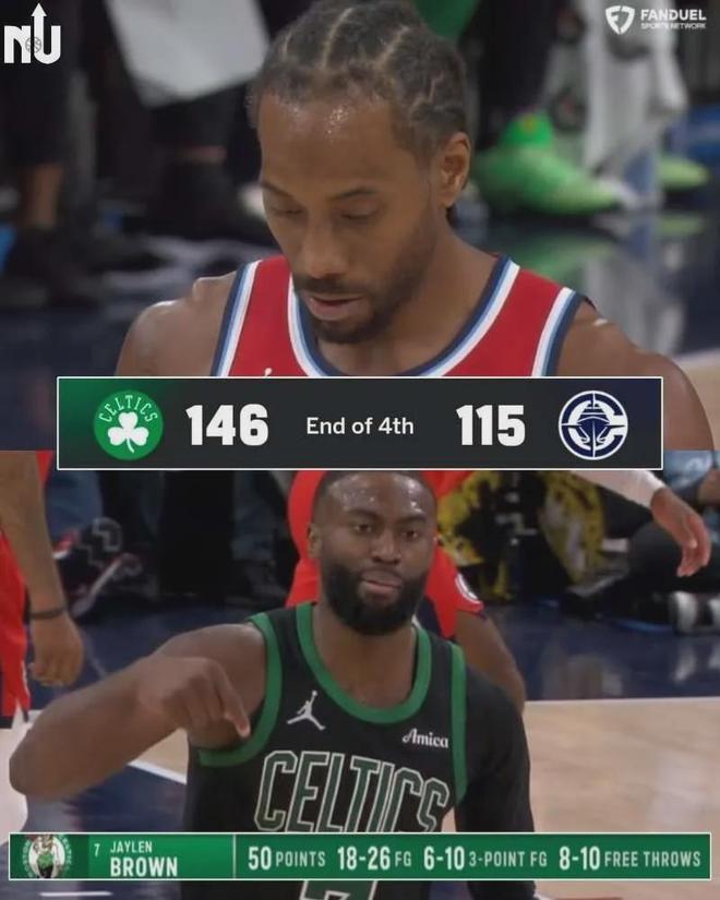 当然,快船过去发挥优异,主要得益于伦纳德天神下凡,然而一旦后者未能carry球队就会溃败,他在如上所述的大比分惨败凯尔特人比赛中出手17次仅中6球,才得到22分外加3板3助3断1帽,与杰伦布朗(50分3板5助)对话中全面落入下风。