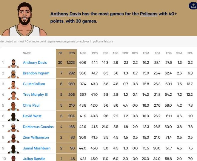 目前,墨菲是鹈鹕队史上单场砍下40+得分次数最多的非全明星球员,同时他以5次40+的表现位居鹈鹕40+得分榜的第四位。
