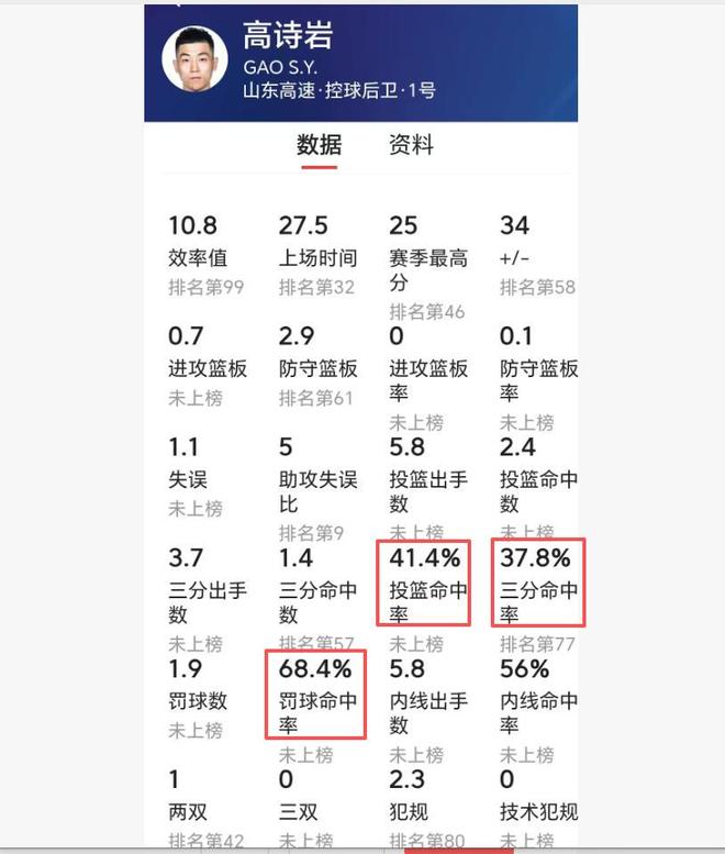 现在网络上流传一句话:广东队也有一个“高铁”,甚至比山东高铁还离谱。不说不知道,一查吓一跳。经过查看数据,胡明轩本赛季真的是比山东高铁还离谱。高诗岩的三项命中率是41%、37%、68%,而胡明轩是31%、23.6%、56.3%,投篮命中率、三分命中率和罚球命中率都比山东高铁低。你难以想象,顶薪球员和队长的罚命中率不到6成,三分命中率只是2成多。胡明轩本赛季真是中了邪了。