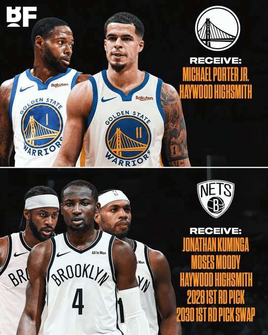 此前,美媒曝光的一笔5换2交易方案引发热议:勇士送出乔纳森·库明加、摩西·穆迪、巴迪·希尔德,以及2028年首轮签和2030年首轮互换权,从篮网得到小迈克尔·波特和海伍德·海史密斯。不过,随后有媒体表示,篮网、勇士都有意扩大交易,即勇士送出年轻控卫波杰姆斯基,篮网再送出托马斯,最终形成一笔6换3交易方案。
