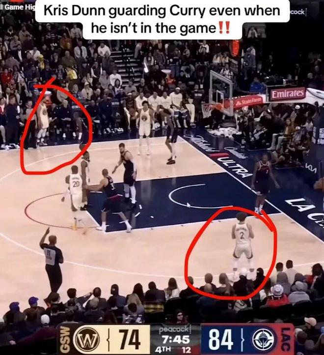 库里都下场了 邓恩还警惕防着他呢
