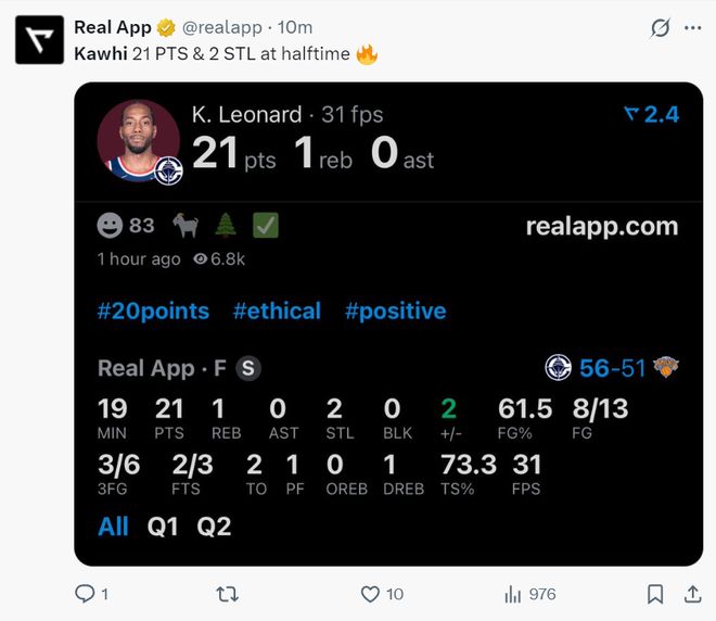 第二节小卡直接暴走,开启了战神卡模式,单节12分钟,9中6+三分4中2+罚球2中1拿到15分1篮板2抢断,半场仅仅19分钟,13中8+三分6中3,拿到21分1篮板2抢断,莱昂纳德一旦进入Zone模式就很难挡住。