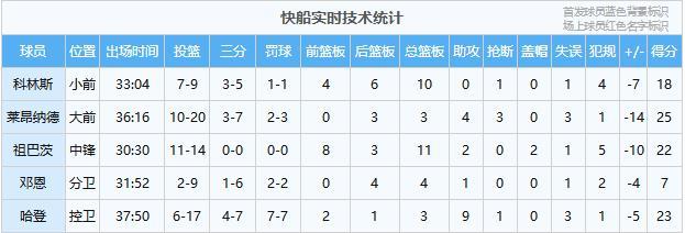 莱昂纳德25分3板4助3断、哈登23分3板9助、祖巴茨22分11板2助2帽、科林斯18分10板、邓恩7分4板1助、米勒6分5板1助、洛佩斯6分、巴图姆3分1板1助、尼德豪泽1分2板、桑德斯1板3助