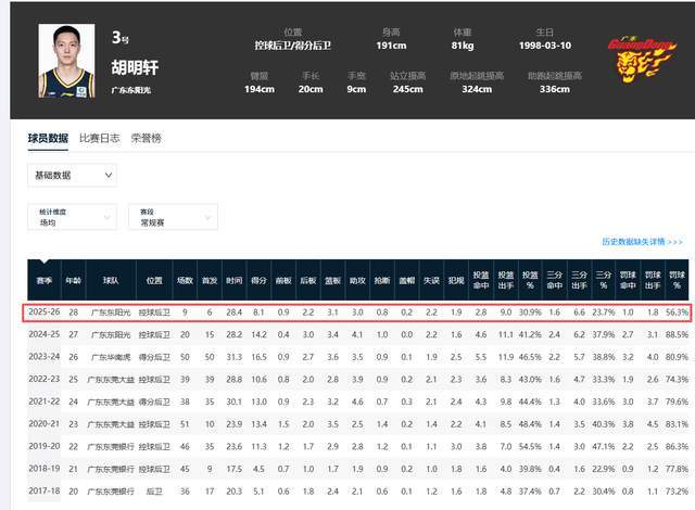 如此数据,可以说,胡明轩已经来到了职业生涯的低谷期,场均8.1分,更是创造了其近7个赛季的新低了。