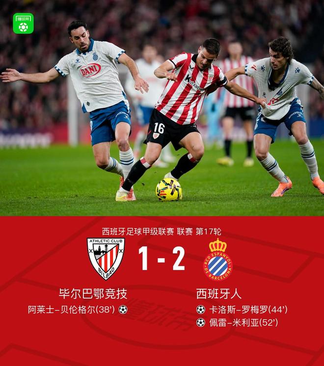北京时间12月23日,西班牙足球甲级联赛第17轮展开角逐,毕尔巴鄂竞技主场迎战西班牙人。上半场,阿莱士-贝伦格尔破门率先取得进球。随后,卡洛斯-罗梅罗扳平比分。下半场,多兰送出助攻,佩兰-米利亚破门将比分反超。最终,西班牙人客场2-1逆转毕尔巴鄂竞技。