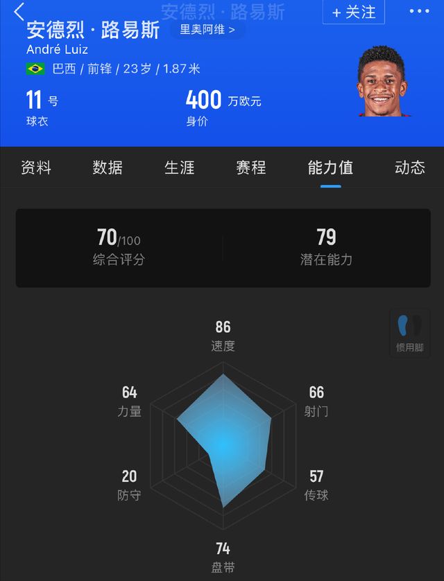 大家一起来瞻仰一下,这位23岁的左脚球员安德烈-路易斯,本赛季15次出场,14次首发,进球5个,助攻5个。可中可边,能打突击。在里奥阿维传统的343阵型里,踢右边锋位置。