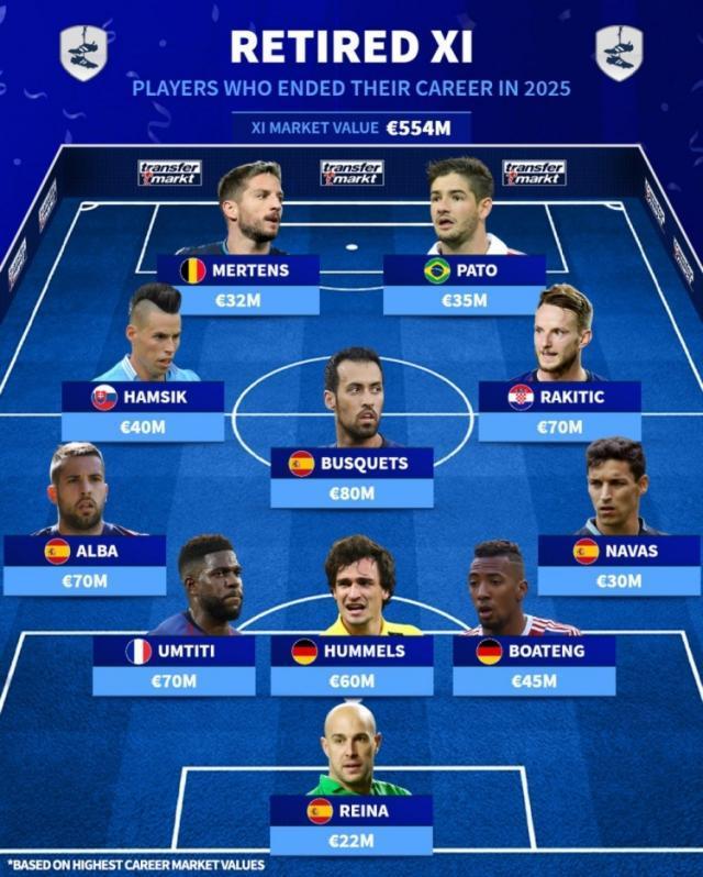 12月28日讯 德国转会市场列出了2025年退役球员阵容,布斯克茨、拉基蒂奇、阿尔巴、帕托在列。