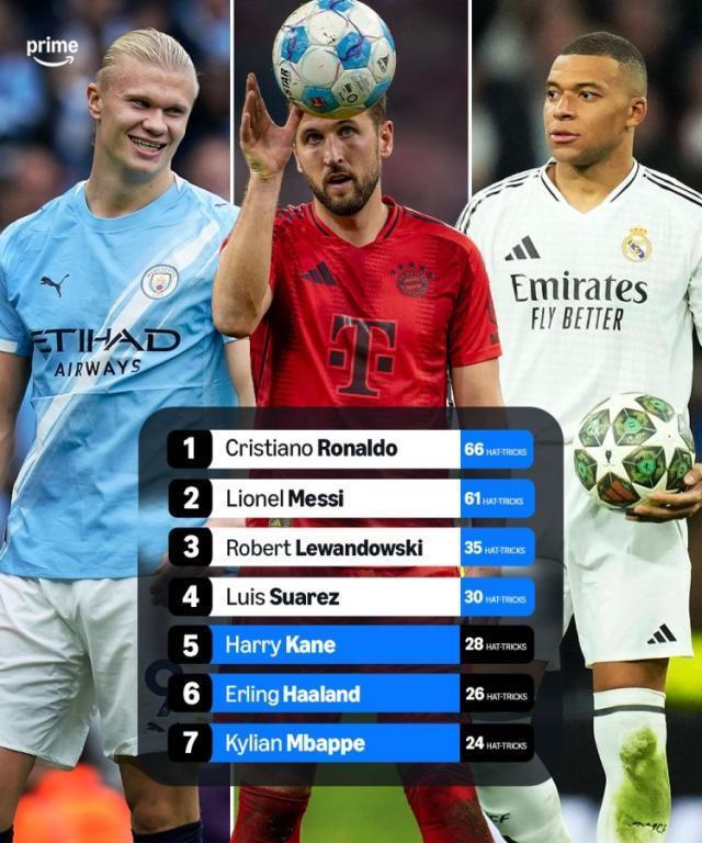 21世纪戴帽次数榜:C罗66次居首,梅西61次第二