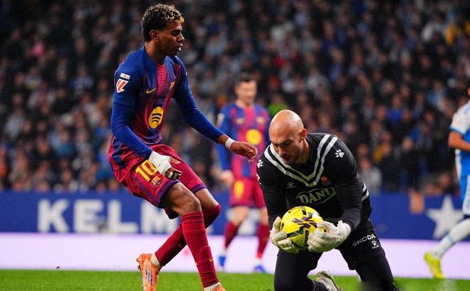 面对西班牙人的气势,巴萨选择用控球降低节奏,避其锋芒。边路的亚马尔频频利用个人能力制造威胁,而费兰托雷斯的头球也是擦着立柱偏出。第39分钟,西班牙人边路再度打出精彩反击,罗梅罗精准传中,米拉门前头球攻门,再次被霍安加西亚神奇扑出底线。半场比赛结束,两队均未破门。