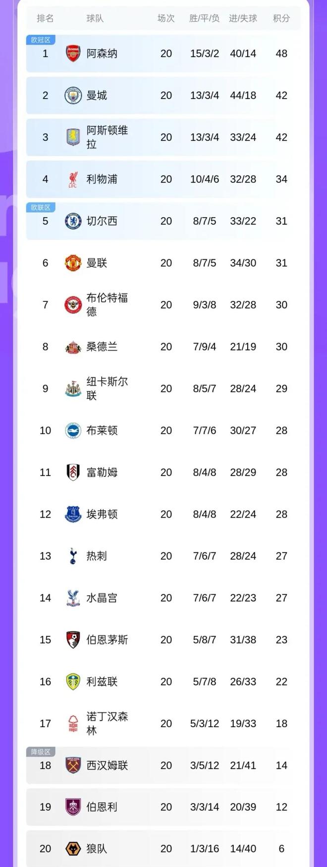 目前英超前6排名:阿森纳领跑,曼城紧随其后,阿斯顿维拉和利物浦分列3、4,切尔西、曼城位列第5和第6名。降级区方面:西汉姆联、伯恩利和狼队分列18、19和20名。