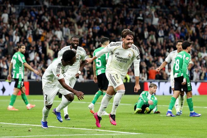 本轮的另一场焦点战,皇马5-1大胜皇家贝蒂斯。如此结果或许有点出乎意料,因为姆巴佩的伤缺,赛前外界并不看好皇马,但实际表现却让人相当惊喜,21岁的贡萨洛·加西亚久违受到重用,上半场先是一记头球为队伍首开纪录,这还仅仅是开始,下半场才真正成为他表演的舞台,凌空世界波+禁区的神龙摆尾式进球,上演帽子戏法闪耀伯纳乌,不负众望成为胜利的最大功臣。