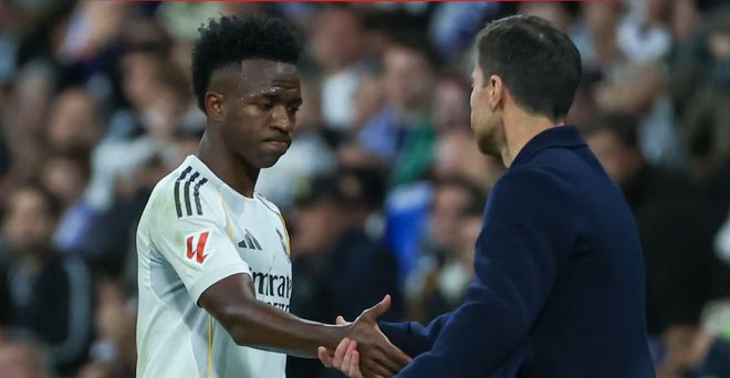 维尼修斯看到换人牌后神情无奈,与教练击掌后便径直走向更衣室通道。