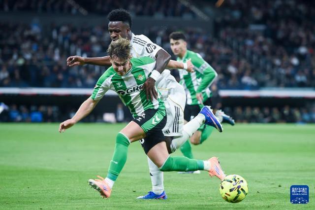 1月4日,皇家马德里队球员维尼修斯(左)和皇家贝蒂斯队球员安赫尔·奥尔帝斯在比赛中拼抢。新华社发(古斯塔沃·巴连特摄)