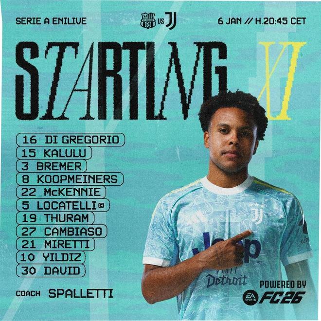 尤文首发:16-迪格雷戈里奥、15-卡卢卢、3-布雷默、8-库普梅纳斯、22-麦肯尼、5-洛卡特利、19-图拉姆、27-坎比亚索、21-米雷蒂、10-伊尔迪兹、30-戴维