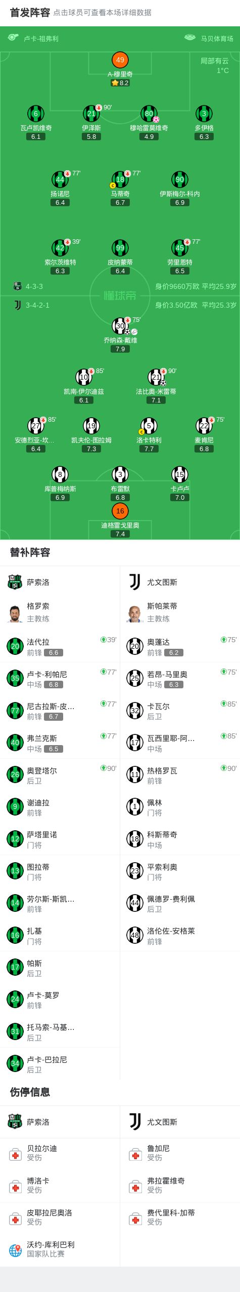 北京时间1月7日,意大利足球顶级联赛第19轮,萨索洛主场迎战尤文图斯。上半场,卡卢卢传球制造穆哈雷莫维奇乌龙。下半场,戴维助攻,米雷蒂破门。萨索洛后卫伊泽斯回传失误,戴维过掉门将为球队锁定胜局。全场比赛结束,尤文3-0击败萨索洛。