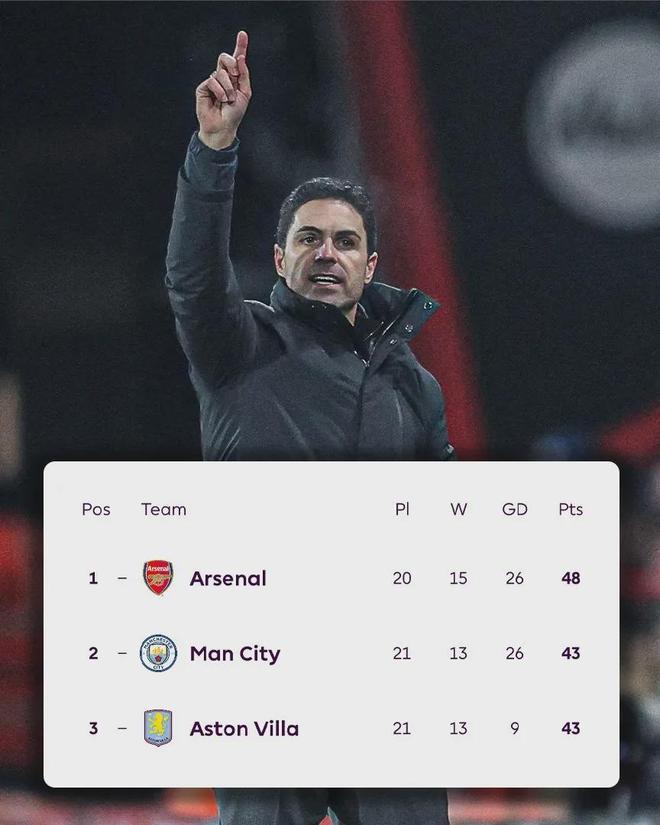 北京时间1月8日,英超第21轮比赛,曼城主场1-1战平布莱顿,维拉则在客场0-0闷平水晶宫。两支争冠球队在本轮同时踩刹车,这让领头羊球队阿森纳看到了扩大领先优势的机会。根据赛程,阿森纳将在1月9日凌晨4点主场迎战利物浦。若能击败对手,枪手领先优势将扩大到8分。