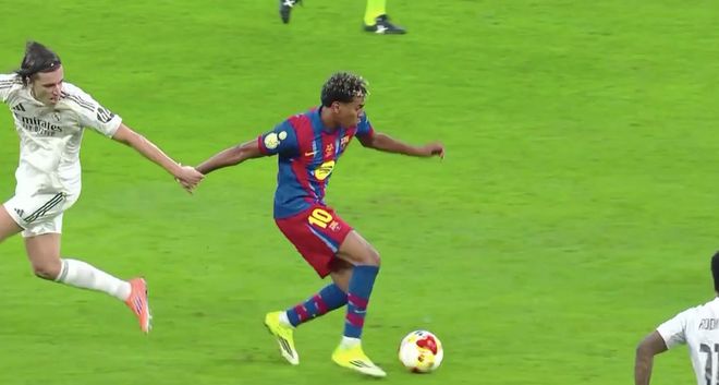 第21分钟,亚马尔出球之后,卡雷拉斯一脚踩在了亚马尔的脚踝上。亚马尔痛苦倒地,卡雷拉斯第一时间上前表达歉意。