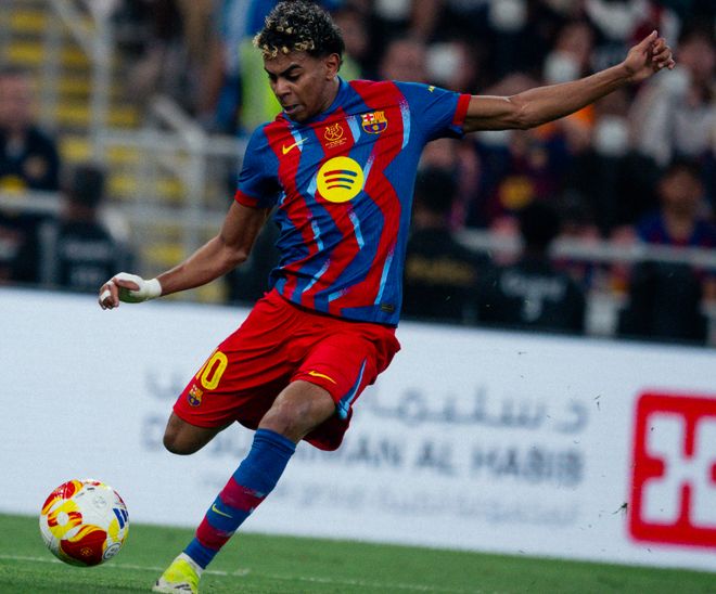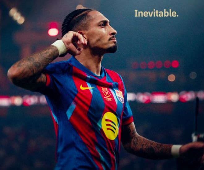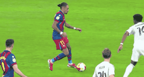 第26分钟,和孔德打出熟悉的配合后,亚马尔加速下底传中,皮球被挡了一下,巴尔德做球,拉菲尼亚起脚爆射,皮球打得有些正。
