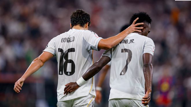 第14分钟,维尼修斯一个加速甩开巴萨防线,看了一眼中路的贡萨洛后,维尼修斯选择自己射门,加西亚将球没收。